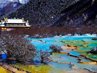 黄龙风景区:争艳池,迎宾彩池,飞瀑流辉,金沙铺地,洗身洞盘景池,黄龙寺,五彩池等奇观,(池态有的形若荷花,有的状如莲叶,有的小可藏袖,有的大若亩田,形状殊异,参差错落。就其水质,清丽明辉,透视度高,水底枯枝苔藓,历历入目。因其水池深度各异堤岸池底各具其色,水草分布差别较大,加上太阳光波的折射、反射和吸收,各个池子异彩纷呈,争艳比美,竞秀斗奇,绮丽壮美,各领风骚。