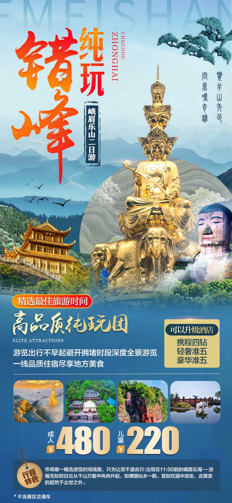 (备注--门票旺季优惠/乐山大佛+峨眉山全程优惠半退50元/人,免票退100元/人)