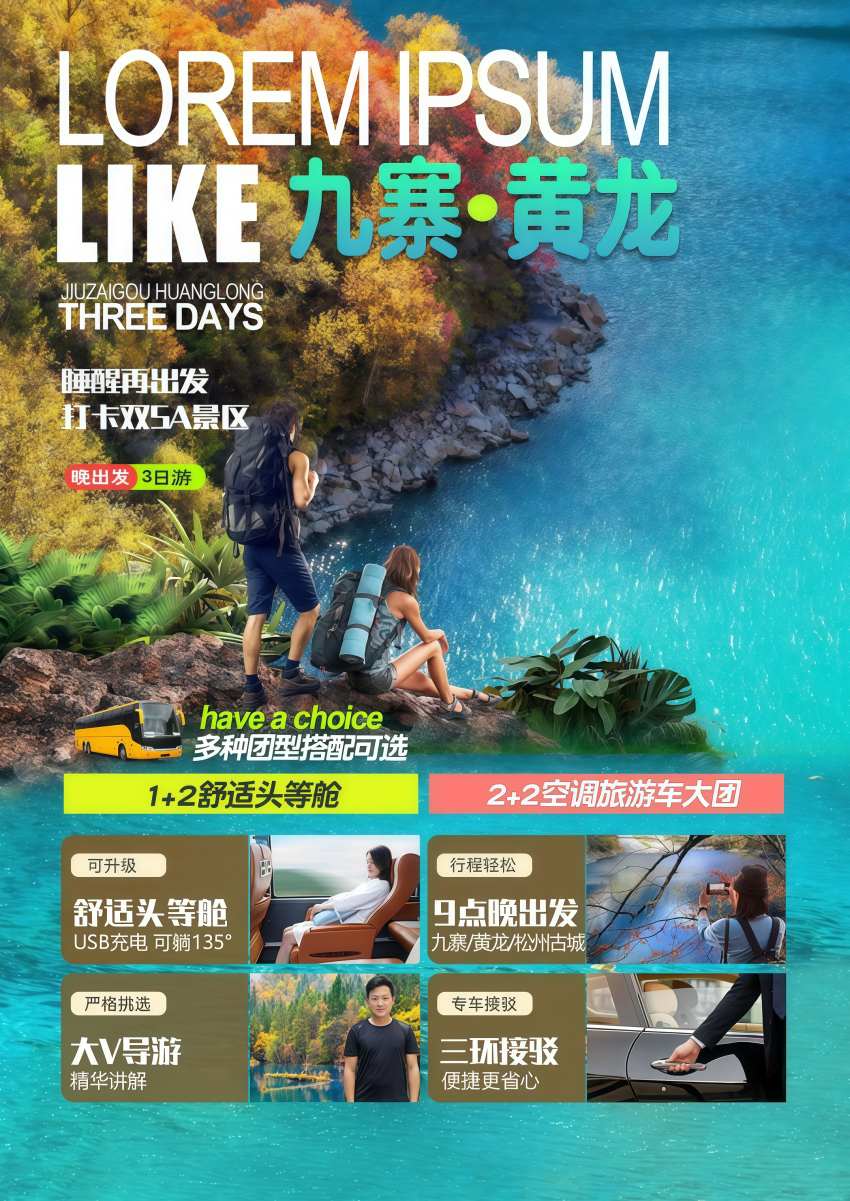 【交通】:全程空调旅游车,九寨沟沟内环保观光车。