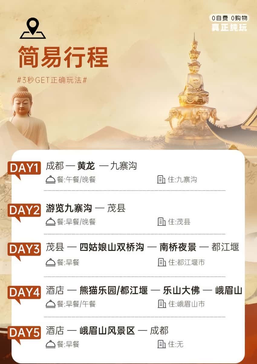 5天4晚-九寨沟·黄龙、四姑娘山、峨眉山、乐山大佛、都江堰或熊猫乐园、夜游南桥 特色:真纯玩团,都江堰+九寨、黄龙,赠送:晚会+藏王土司餐