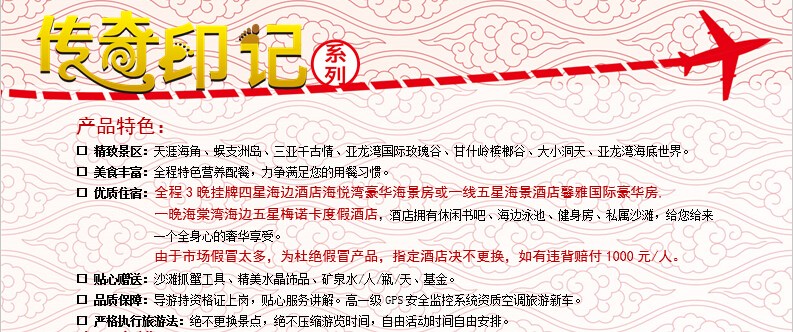 【旅游交通】:经济舱往返飞机(含机建燃油费),海南一地接送机服务.海南地接指定委派高一级GPS安全监控系统资质空调旅游新车。因海南政策性滚动发车,旅行社仅能保证给每位游客提供每人一正坐,21座以下车型均无行李箱。